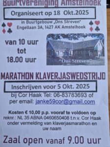 Klaverjasmiddag Date: 25 oktober, 2025 Add to Calendar Google CalendarMicrosoft OutlookApple CalendarDownload Time: 13:30 - 17:30 Calendar: Openbaar